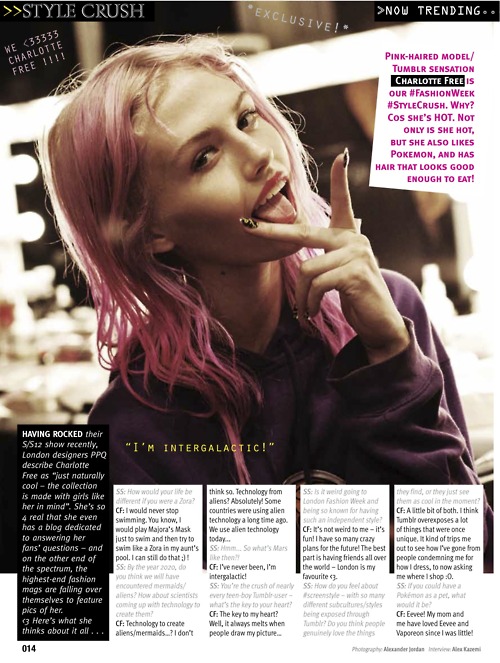 The free-spirited, pink-haired little pixie that is Charlotte Free. Although the newest model sensation, she also comes across as being extremely down to earth and, well, lovely. Im addicted to her tumblr, too, its fantastic! We also share a love for Zelda and all-things cosmic-related. I really think we could be besties. 🙂