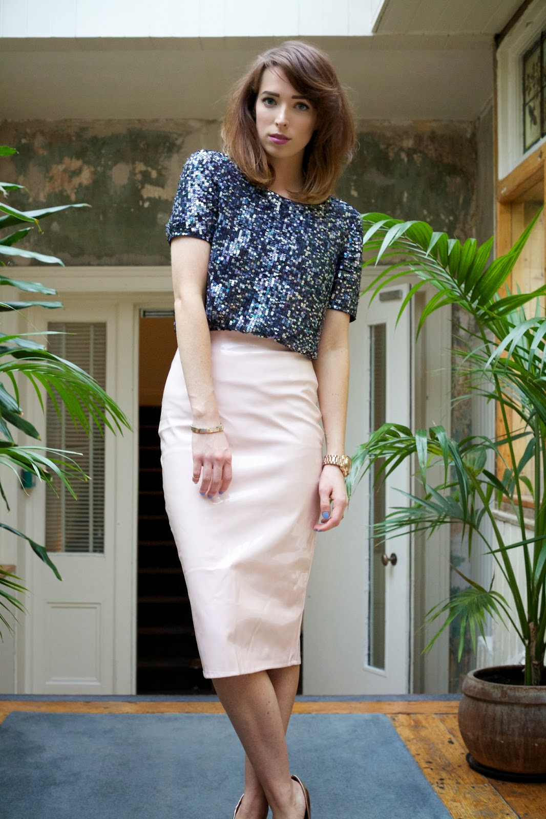 One of the things I love most about this time of the year is that you can get away with that bit more in your party outfits. More sequins, more colours, more faux fur, when the festive season rolls around, it all sounds good to me! I decided to put together a party look that I would love to be wearing in over the next few weeks, consisting of some new and old pieces. Firstly, lets talk about the skirt. I picked up this baby pink PVC beauty on Missguided after stalking it for a few weeks, and I have to say that I’m so happy with it. I teamed it with a sequin tee, which I have to admit is one of my favourite pieces in my wardrobe, and I wear it all year round. It’s not available in the shops anymore, but I also love this one and this one from Topshop, who have some great sequin tees at the moment.